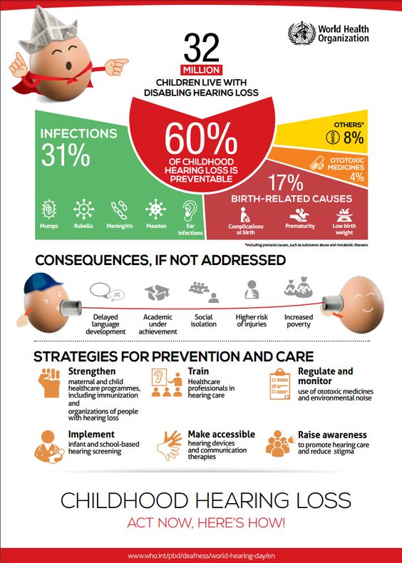 - 50% of hearing loss is preventable through public actions such as immunization, healthy ear and hearing care habits, and effective treatment for both acute and chronic ear conditions
